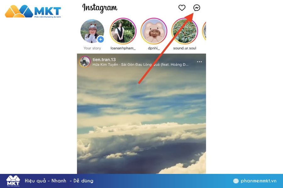 Bước 1: Mở Instagram trên điện thoại của bạn. Nhấn vào biểu tượng tin nhắn ở góc phải trên màn hình để vào mục tin nhắn.