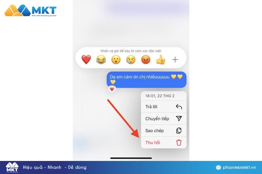 Bước 2: Chọn cuộc trò chuyện mà bạn muốn xóa. Nhấn và giữ vào tin nhắn mà bạn muốn thu hồi. Một menu sẽ xuất hiện ở dưới, bạn chọn Thu hồi.