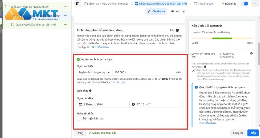Bước 2: Chọn Ngân sách cho chiến dịch, set lịch chạy cho chiến dịch.