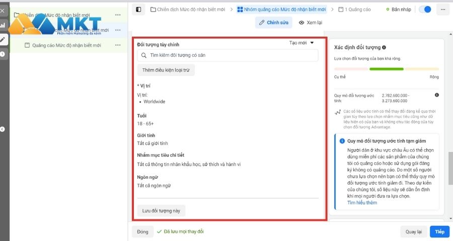 Bước 3: Chọn Đối tượng cho chiến dịch của bạn, có một số yếu tố cơ bản như: khu vực và tuổi, ngoài ra bạn có thể target sâu hơn về sở thích và nhân khẩu học của khách hàng để nhắm đối tượng mục tiêu chính xác hơn.