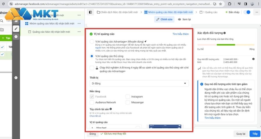 Bước 4: Lựa chọn Vị trí quảng cáo. Đa phần các vị trí quảng cáo lựa chọn phổ biến nhất là bảng tin Facebook. Bạn nên tự lựa chọn vị trí quảng cáo cho chiến dịch của mình hoặc nếu bạn chưa rõ về vấn đề này, hãy sử dụng vị trí quảng cáo Advantage.