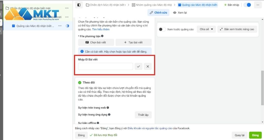 Bước 5: Sang mục “Quảng cáo”, chọn ID bài livestream của bạn và ấn tiếp tục. Chiến dịch của bạn sẽ được duyệt sau ít phút.