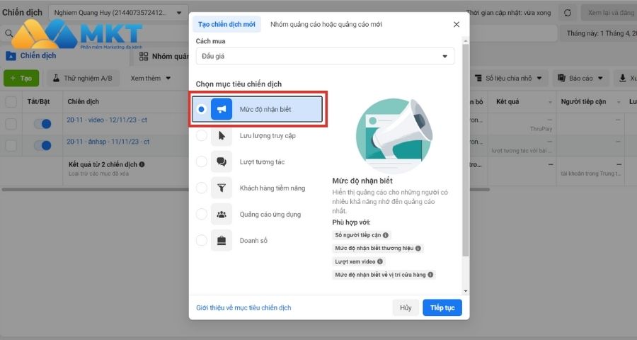 Bước 1: Vào Trình quản lý quảng cáo và chọn mục “Tạo” và chọn “Mức độ nhận biết”